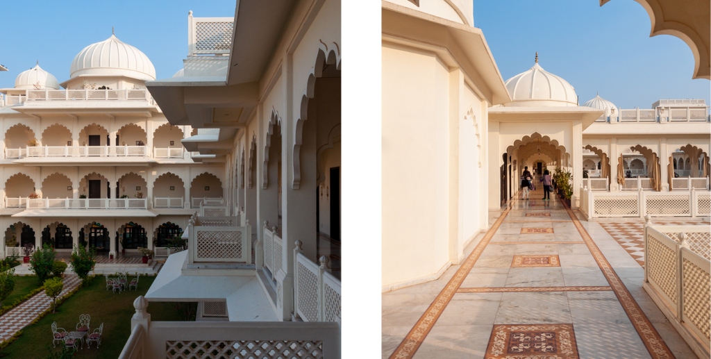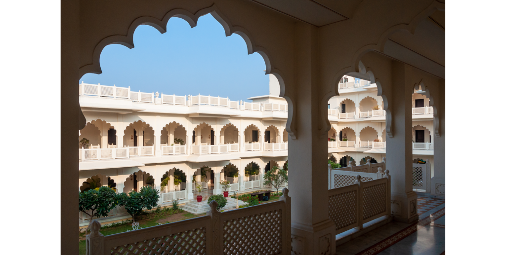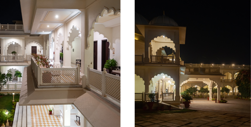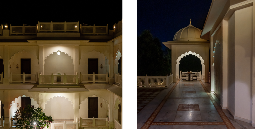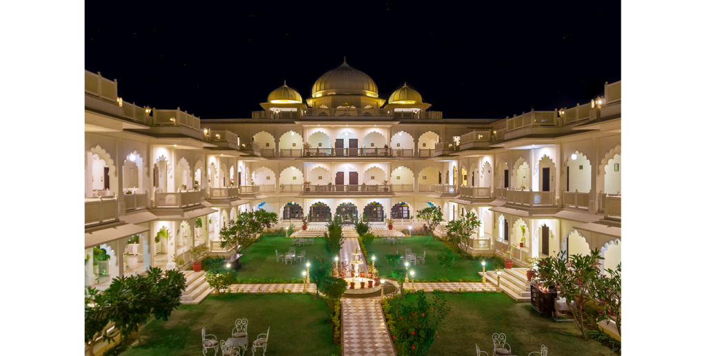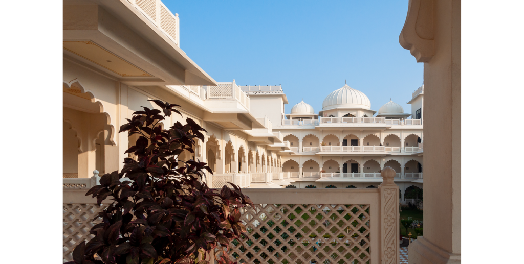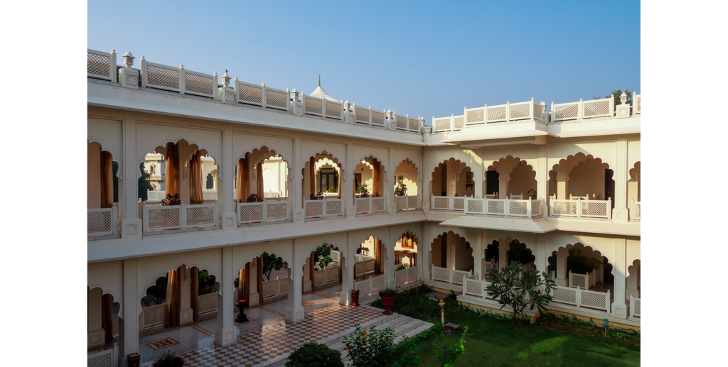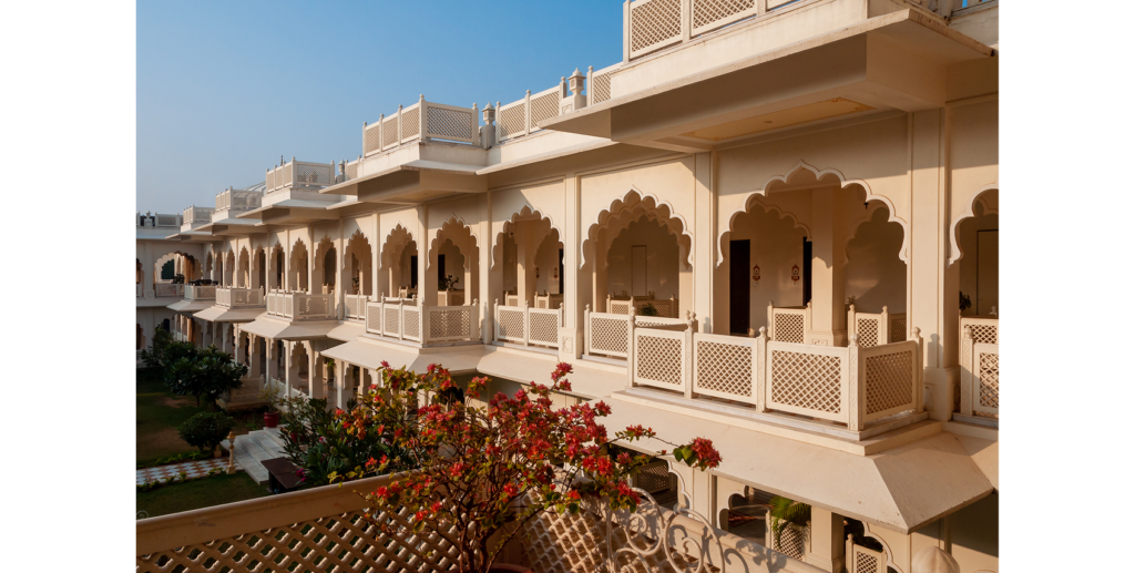 This luxurious 5-star resort embodies the grandeur of Rajasthani heritage. Featuring 40 opulent rooms, 4 palatial suites, multiple dining areas, a banquet, private gardens, a pool, and a spa, the resort blends traditional elements like jharokhas, chhatris, and char bagh courtyards with modern hospitality. Hand- painted murals, intricate jali work, and floral inlay flooring enhance the timeless charm, offering an immersive experience of Rajasthan’s architectural splendor