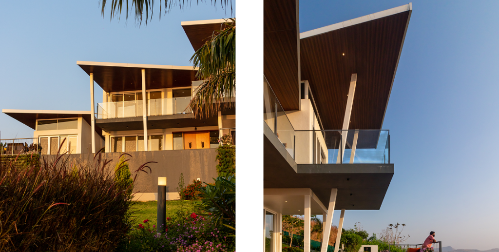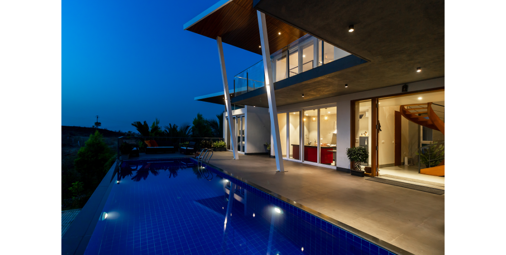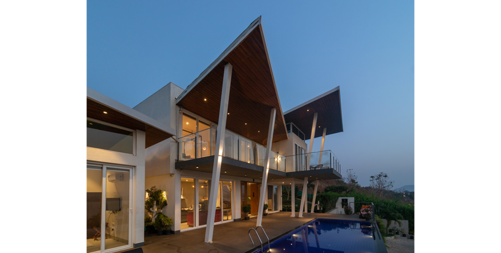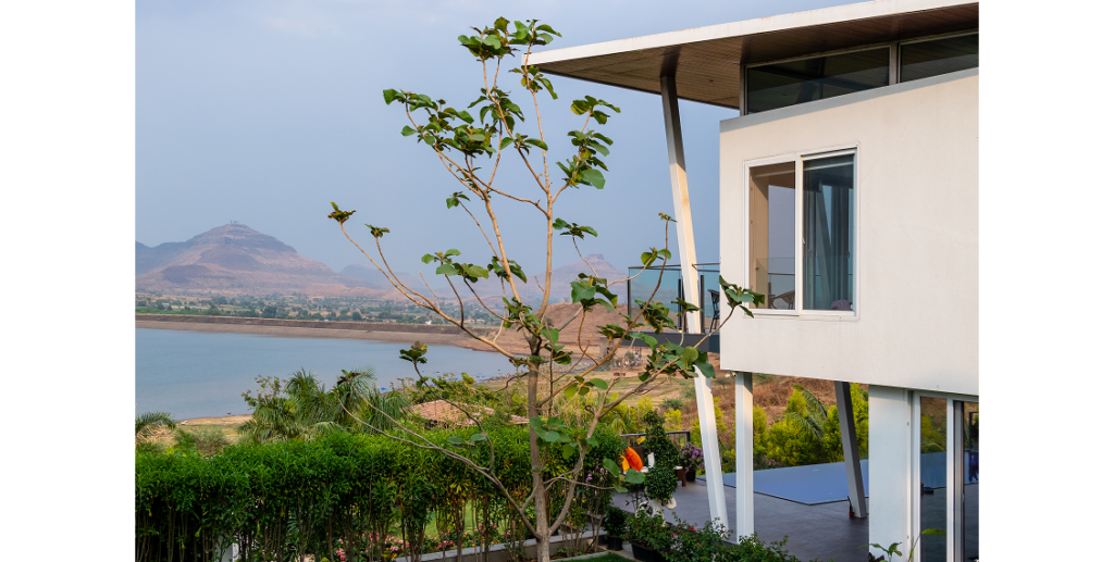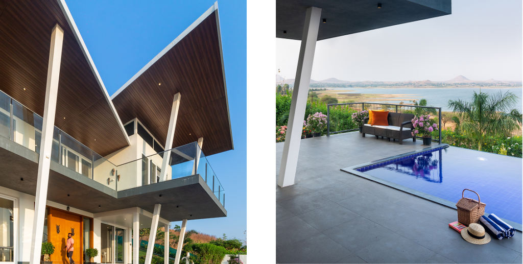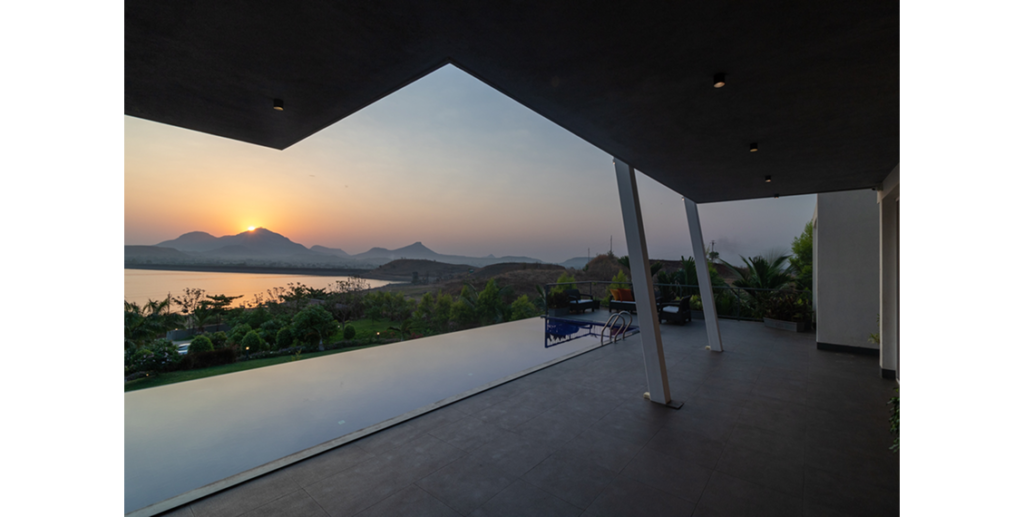 A 3000 sq. ft. weekend villa near Alandi Dam in Nashik, seamlessly blends minimalistic architecture with nature. The villa captures 180-degree views of its hilly surroundings, featuring cantilevered forms, organic concrete textures, and barrier-free spaces that merge the indoors with the outdoors.