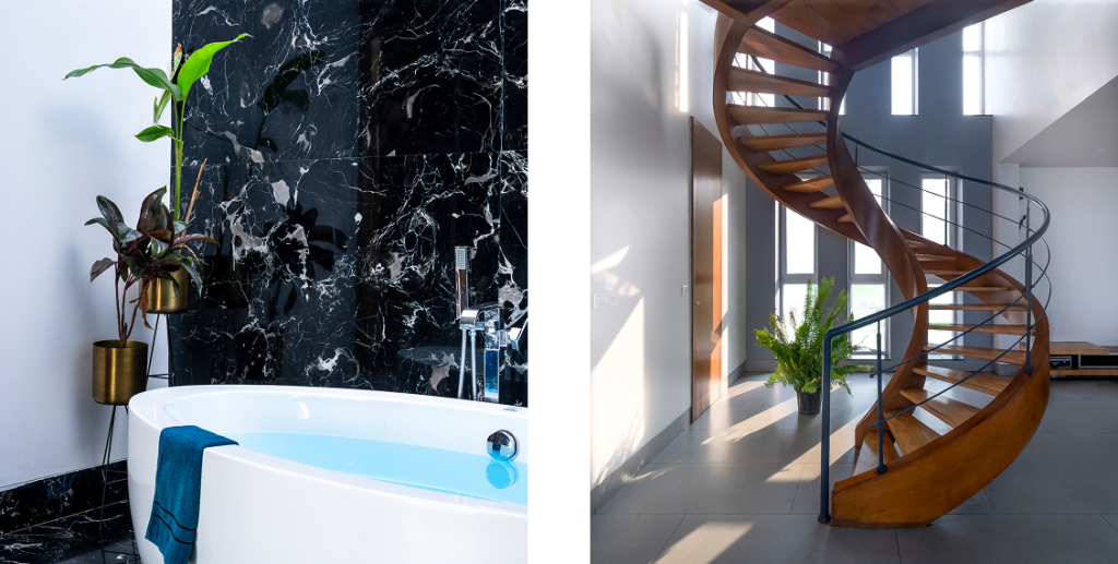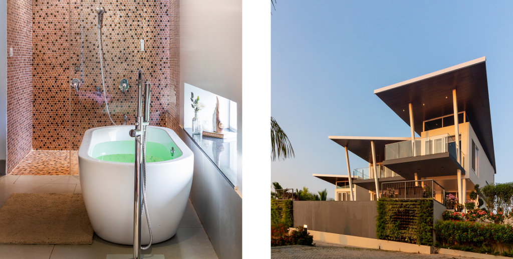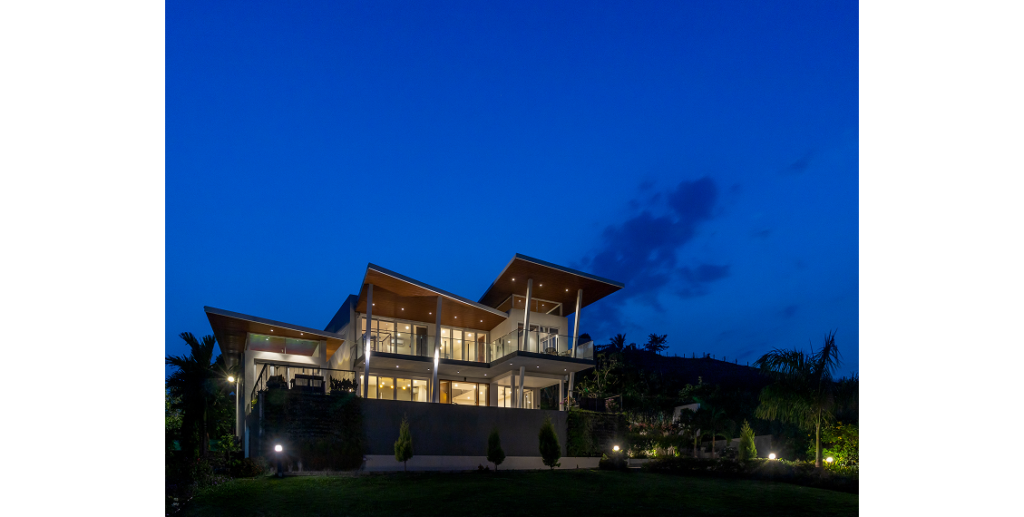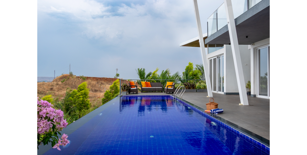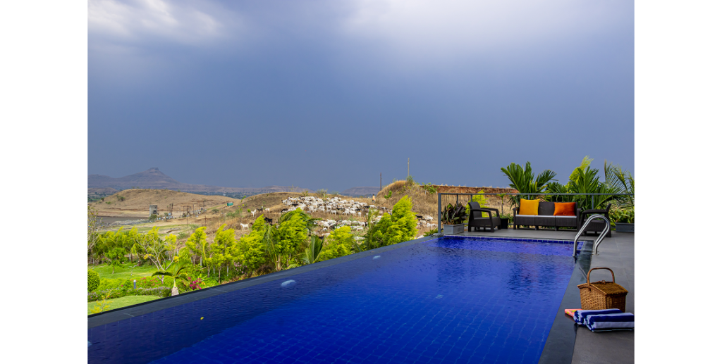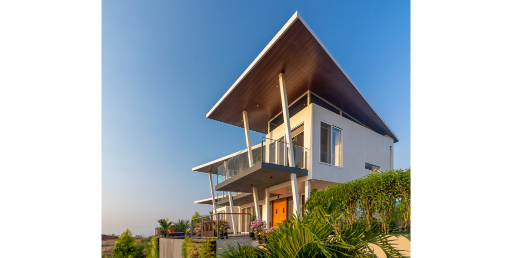 A 3000 sq. ft. weekend villa near Alandi Dam in Nashik, seamlessly blends minimalistic architecture with nature. The villa captures 180-degree views of its hilly surroundings, featuring cantilevered forms, organic concrete textures, and barrier-free spaces that merge the indoors with the outdoors.
